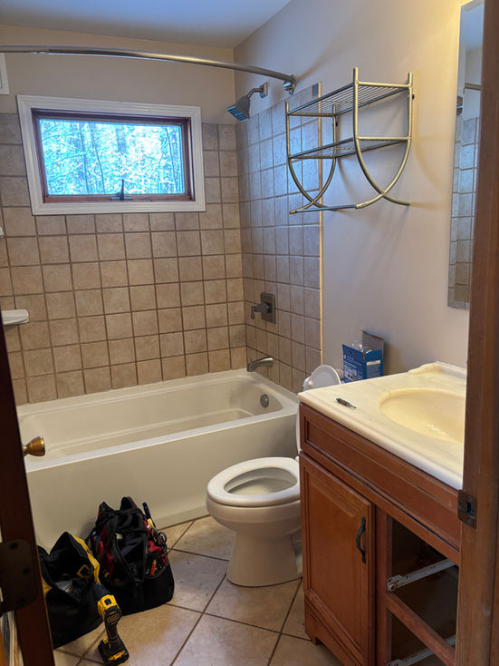 Recent Bathroom project- removed old vanity & tile, painted, set new tile & new vanity, cut & installed new baseboards, hung new shower curtain rod, towel bars & more.